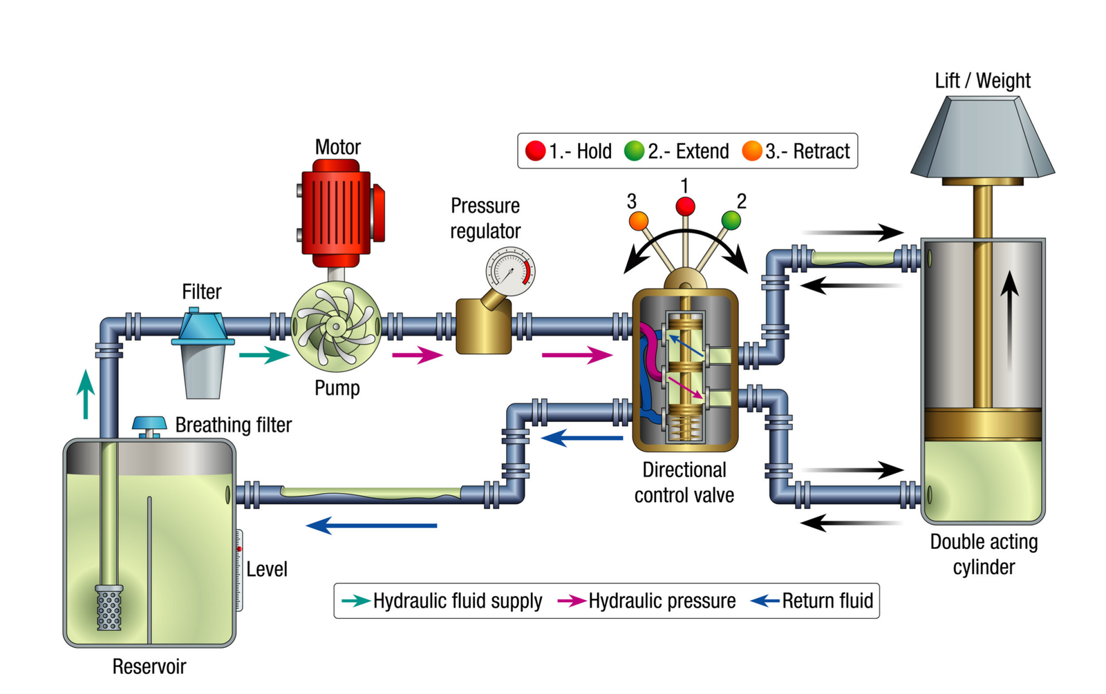 A complete hydraulic system mainly consists of five parts working together:
