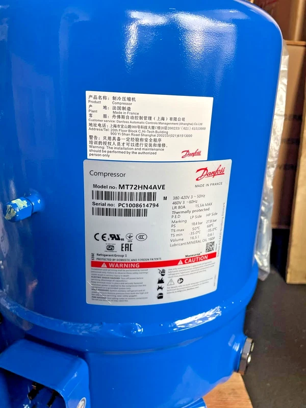 High-efficiency Danfoss MT72HN4AVE compressor designed for reliable industrial refrigeration applications.